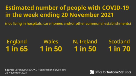 根据国家统计局(ONS)的最新估计,英格兰每65人中就有1人感染,威尔士每50人中有1人感染,北爱尔兰为每50人中有1人,而苏格兰地区是70人中有1人感染。