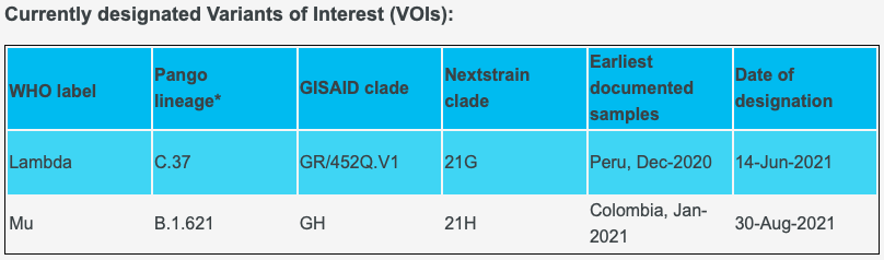 此外,有2种新冠病毒变种被列为“需要留意”(Variants of Interest, VOI)的变种,分别是:最早在秘鲁发现的Lambda和哥伦比亚发现的Mu。