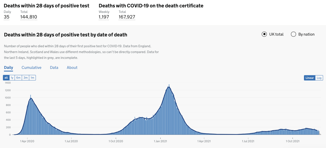 目前英格兰地区使用呼吸机的新冠患者有793人(-3);病亡新冠患者总计125,974人(+21)。