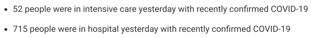 从2020年3月5日以来,苏格兰地区共有25,194名(+114)确诊患者出院。截至11月29日午夜,近期住院的疑似/确诊新冠患者715名(-19),其中52名(-8)确诊新冠在重症监护室ICU。