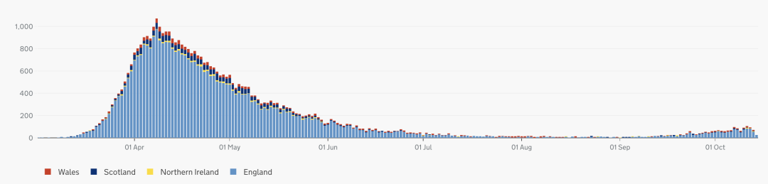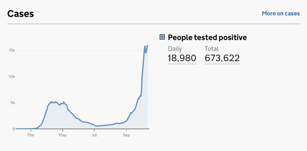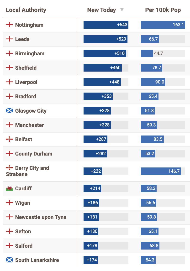 在新增前20当中,还有苏格兰的格拉斯哥(+328)、北爱尔兰的贝尔法斯特(+287)、德里(+222)以及威尔士的卡迪夫(+214)疫情也较为严重。