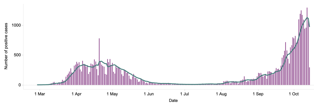 截止至2020年10月15日(周四)英国时间09:00,累计检测结果量26,301,012次(+295,690);累计确诊673,622例(+18,980);累计病亡43,293例(+138)。
