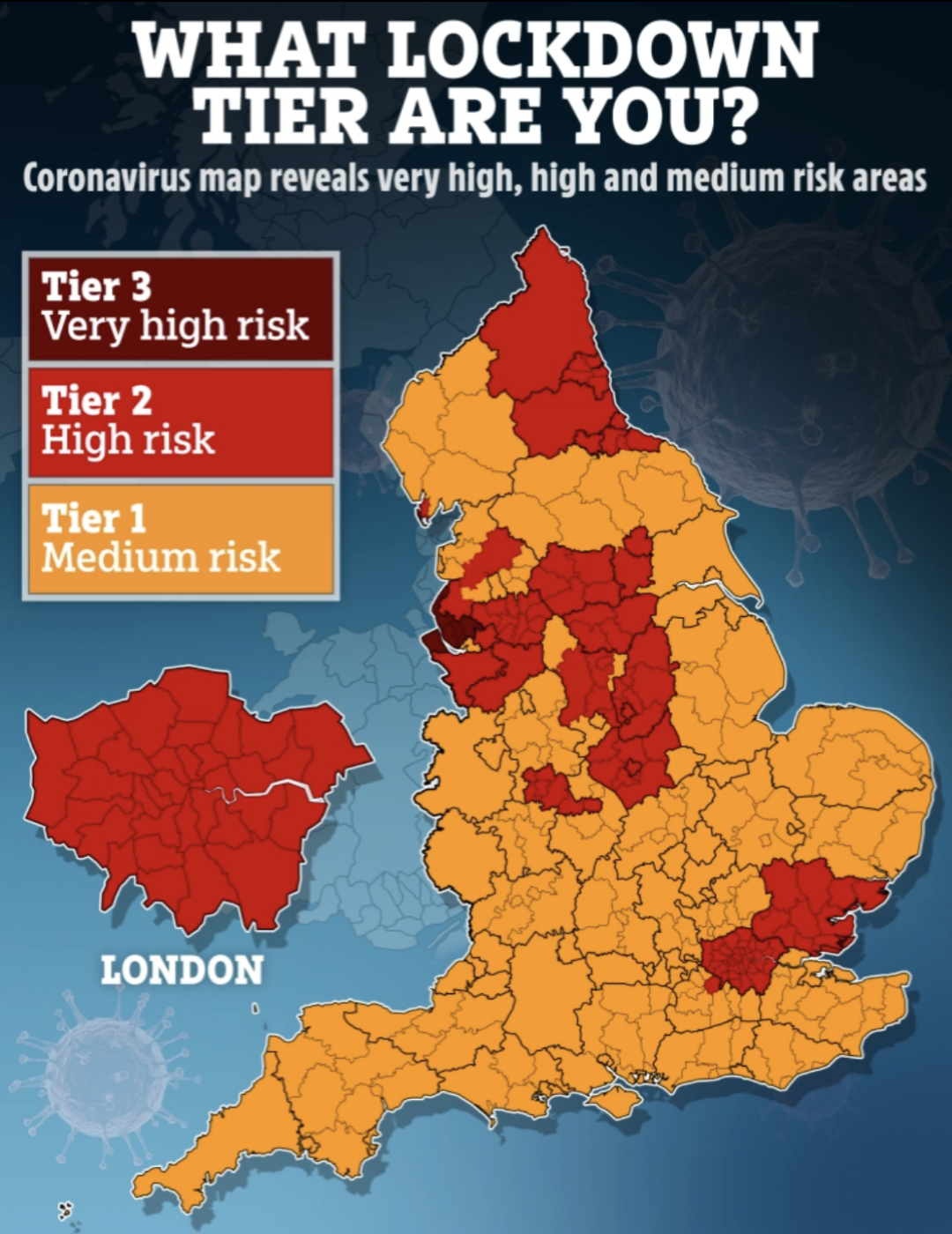 「1级地区 - Medium 中级」适用于目前英国全国——执行现行的社交距离措施、六人禁令以及22:00酒吧和餐厅宵禁