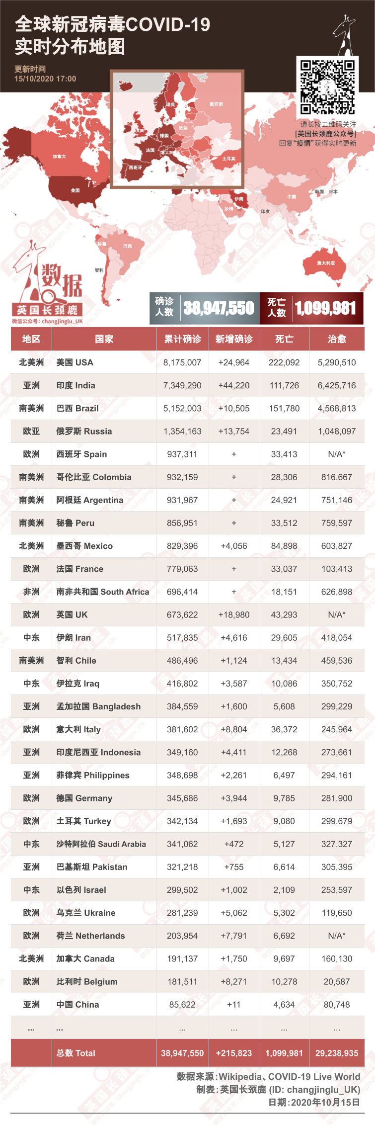 世界的累计确诊人数截止10月15日17:00超过3,894万例(+390k),死亡超过109.9万例(+5k)。