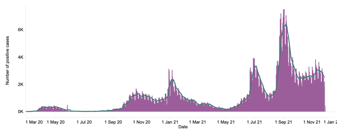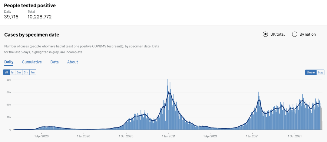截止至2021年11月30日(周二)英国时间09:00,累计检测结果量354,378,456(+1,014,359);累计确诊10,228,772例(+39,716);累计病亡144,969(+159)。