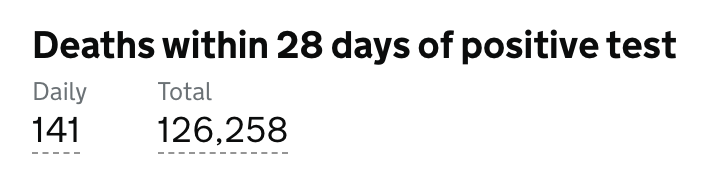 目前英格兰地区使用呼吸机的新冠患者有773人(+13);病亡新冠患者总计126,258人(+141)。
