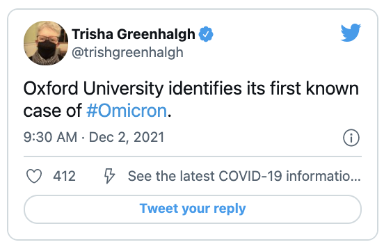 12月2日(周四),初级保健教授Trisha Greenhalgh透露:牛津大学发现了首例Omicron变种。据悉,官方在发现新变种后,已经恢复了图书馆、讲座和课堂教学的佩戴口罩要求。
