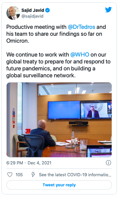 英国卫生部长Sajid Javid也在今天上午会见了世界卫生组织总干事Tedros Adhanom Ghebreyesus。他在社交媒体上写道。”与Tedros博士和他的团队进行了会晤,分享我们迄今为止对Omicron变种的研究结果。