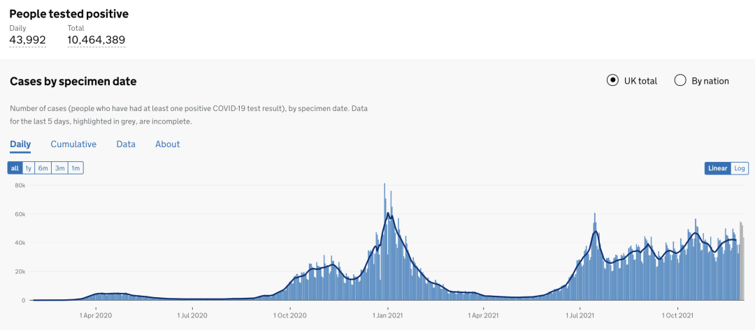 截止至2021年12月5日(周日)英国时间09:00,累计检测结果量360,898,625(待更新);累计确诊10,464,389例(+43,992);累计病亡145,605(+54)。