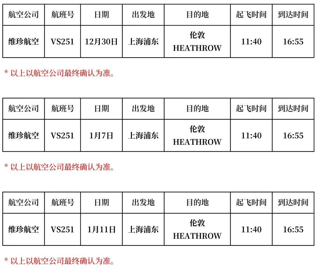 目前计划提供3次航班包机,分别于2021年12月30日,2022年1月7日以及1月11日——上海直达伦敦的包机航班。
