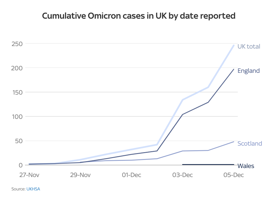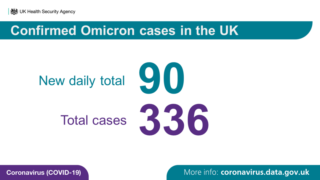 12月6日(周一),英国再次公布了在过去24小时内新增的Omicron新变种90例,包括英格兰的64例,苏格兰23例和威尔士3例。这使得英国的Omicron病例总数达到336例。