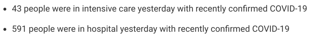 从2020年3月5日以来,苏格兰地区共有25,581名(+116)确诊患者出院。截至12月6日午夜,近期住院的疑似/确诊新冠患者591名(-61),其中43名(-3)确诊新冠在重症监护室ICU。