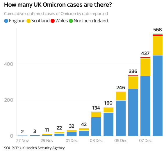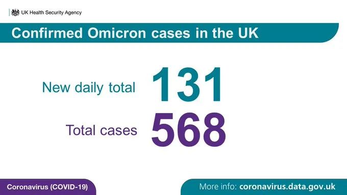 据12月8日(周三)报告,英国各地新增131例Omicron变种记录,较前一天增加约30%,使全英该变种确诊总数达到568例。