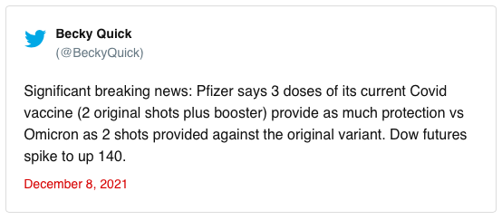 在辉瑞公司12月8日(周三)与BioNTech公司发布的第一份联合声明中称,根据实验室测试,虽然两剂辉瑞疫苗会导致针对Omicron变种的中和抗体明显降低,但再次接种第三剂疫苗又可以使中和抗体增加25倍。