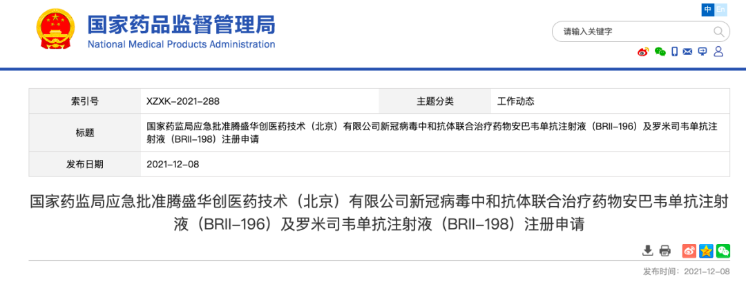 12月8日,中国国家药品监督管理局应急批准腾盛华创医药技术(北京)有限公司新冠病毒中和抗体联合治疗药物安巴韦单抗注射液(BRII-196)及罗米司韦单抗注射液(BRII-198)的注册申请。这是国内首家获批的自主知识产权新冠病毒中和抗体联合治疗药物。