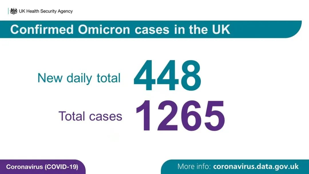 英国12月10日报告新增448例Omicron变种病例,其中英格兰确诊443例,苏格兰1例,威尔士4例。英国目前该新变种病例总数达1,265例。