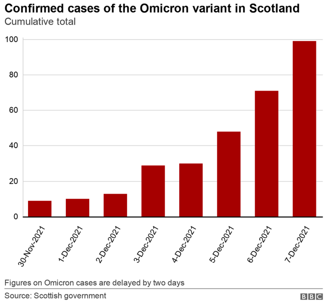 在苏格兰首席大臣Nicola Sturgeon在今日的发布会上表示,苏格兰地区已经报告了110例Omicron变种病例,但这只是“冰山一角”。