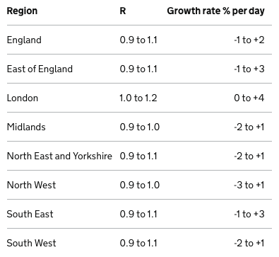 英国卫生局说,英格兰的新冠感染率R值估计保持在0.9-1.1之间。这意味着每10个感染者,他们平均会感染9到11个其他人。而感染每日增长估计在-1%和+2之间。