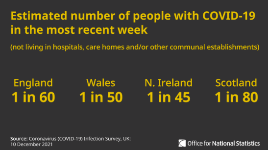 而国家统计局的最新周报表明,在截至12月1日的一周内,英格兰每60人中就有1人感染新冠,这一估计与前一周相比没有变化,而苏格兰的感染率则有所下降。