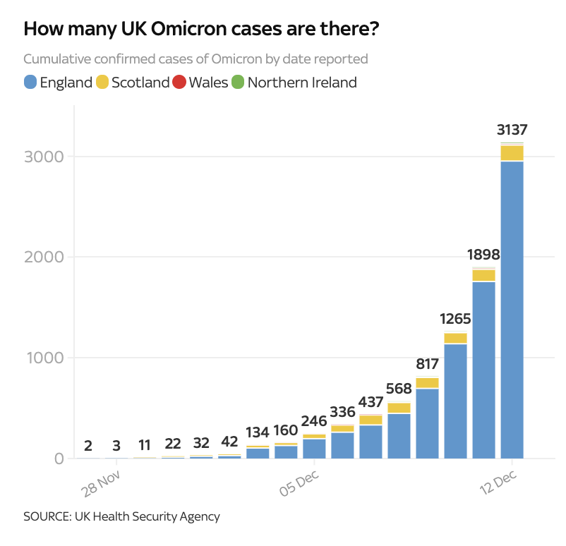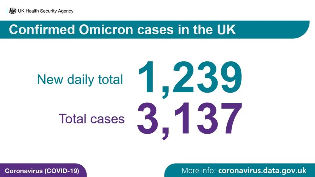 12月12日,英国记录新增1,239例Omicron变种病例,是自该变种在英国被发现以来最大的日增长量,使英国目前确诊该新变种病例总数达3,317例。