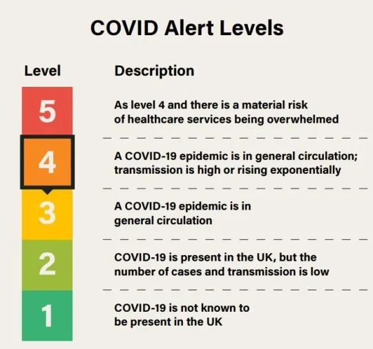 该警戒等级在去年5月时由政府科学顾问小组SAGE提出,主要反应病毒的传播水平。共有5个级别,4级仅次于最高级5级。