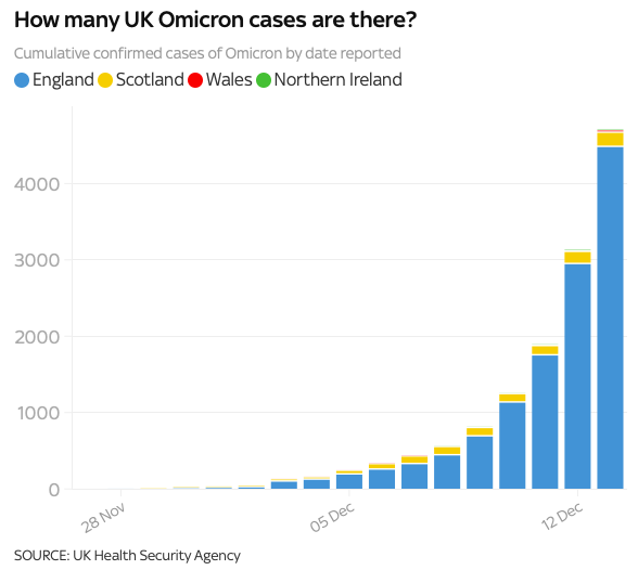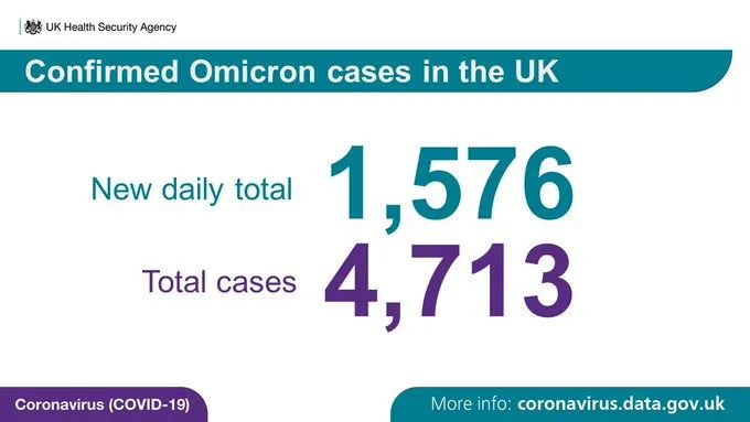12月13日,英国新增1,576例Omicron变种病例,使该变种确诊总数达到4,713例。
