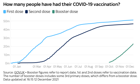 而12月11日(周六),英国进行了超过53万剂加强疫苗的接种,该数字创下11月10日以来第二高的单日接种纪录,但仅仅是目标接种量的一半。