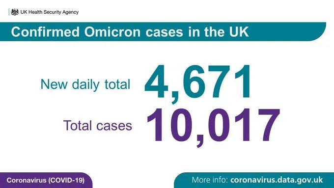 12月15日,英国报告新增4,671例Omicron变种病例,使全国确诊该新变种的总数翻了一番,升至10,017例。