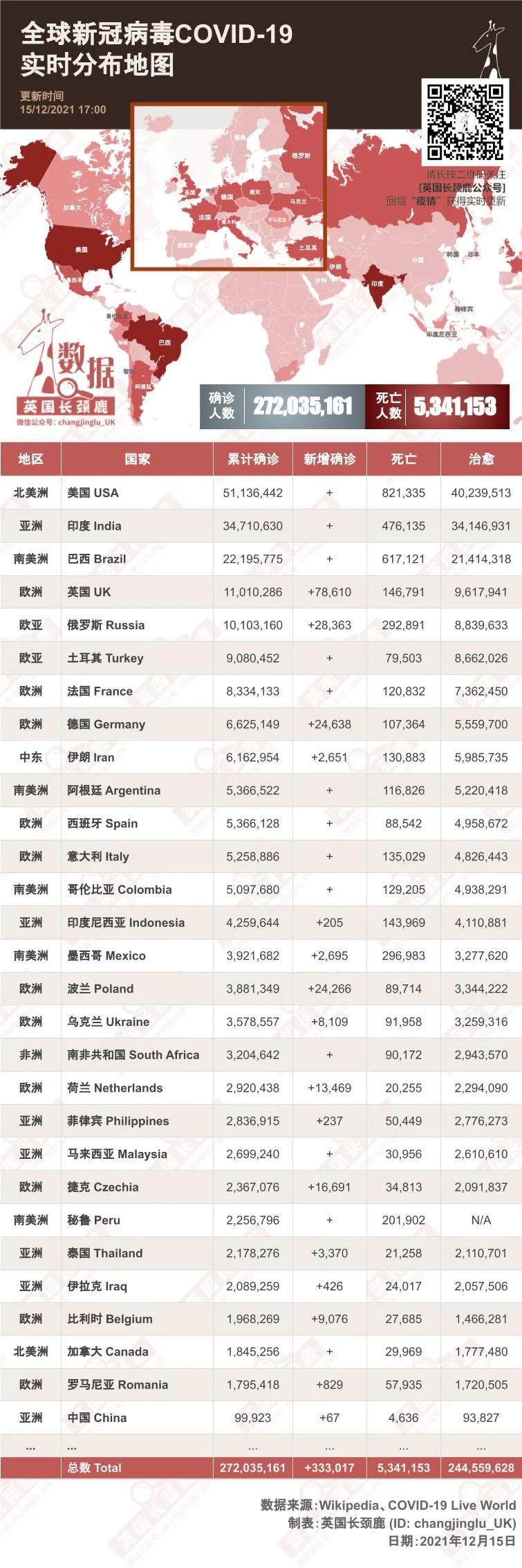 世界的累计确诊人数截止12月15日17:00超过2亿7,203万例(+309k),死亡超过534万例(+4k)。