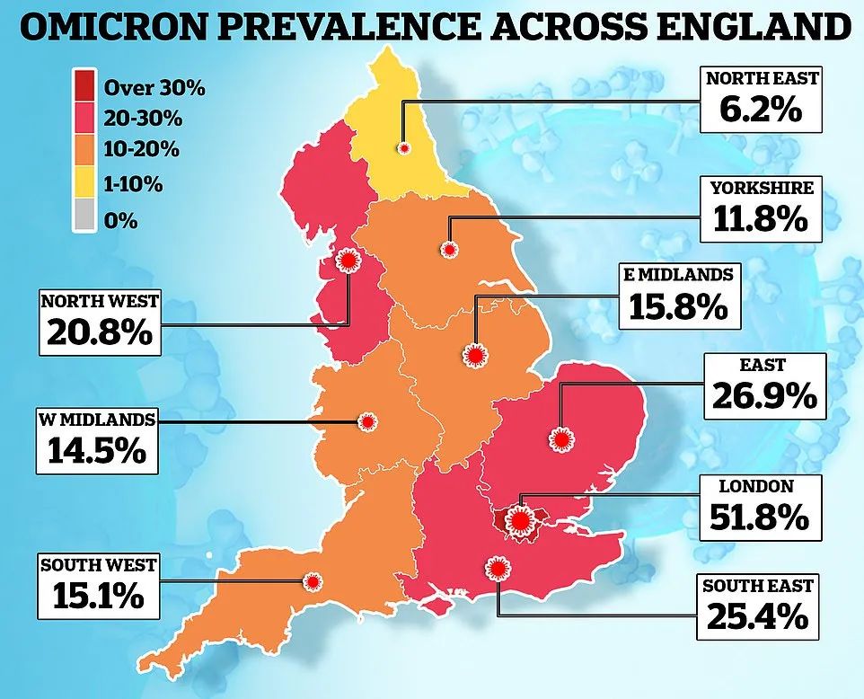 Omicron变种在英格兰的感染比率 | 图片来源Dailymail