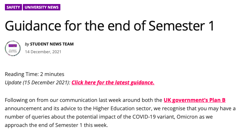 曼彻斯特大学在12月15日发布的最新安排中提到,大部分线下面对面教学将继续进行,但部分课程会临时转至在线教学,以便在圣诞假期前为学生的安排提供更多灵活性。
