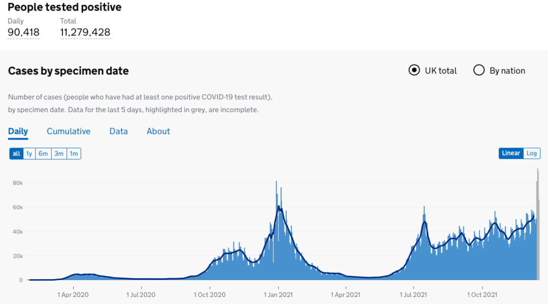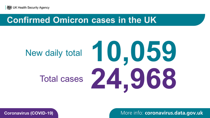 英国12月18日报告10,059例新增Omicron变种确诊病例,是昨天记录数字的三倍。