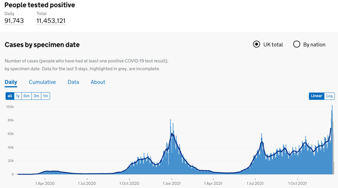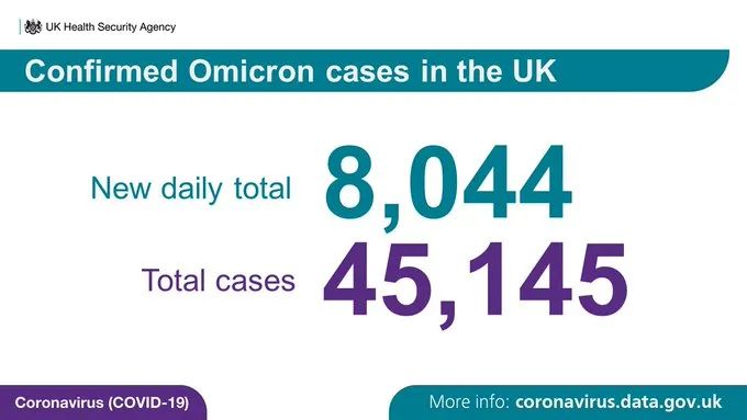 12月20日(周一),英国各地报告新增8,044例Omicron变种确诊病例。使得全英该新变种确诊病例总数为45,145例。
