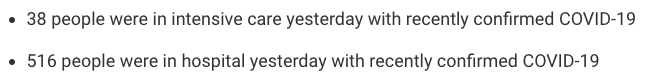 从2020年3月5日以来,苏格兰地区共有26,309名(+126)确诊患者出院。截至12月20日午夜,近期住院的疑似/确诊新冠患者516名(-6),其中38名(+5)确诊新冠在重症监护室ICU。