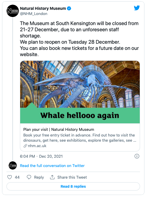 另一边,伦敦自然历史博物馆(London's Natural History Museum)将从12月21日起被迫闭馆。它在一份声明中说:“由于受到新冠病毒感染和人员隔离要求的影响,我们决定从12月21日(周二)开始关闭南肯辛顿博物馆(The South Kensington Museum)。“