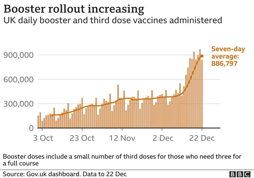 在英国,这是加强剂疫苗接种破纪录的一周,12月22日(周三)英国接种了超过968,665剂疫苗,是迄今为止的最高纪录。