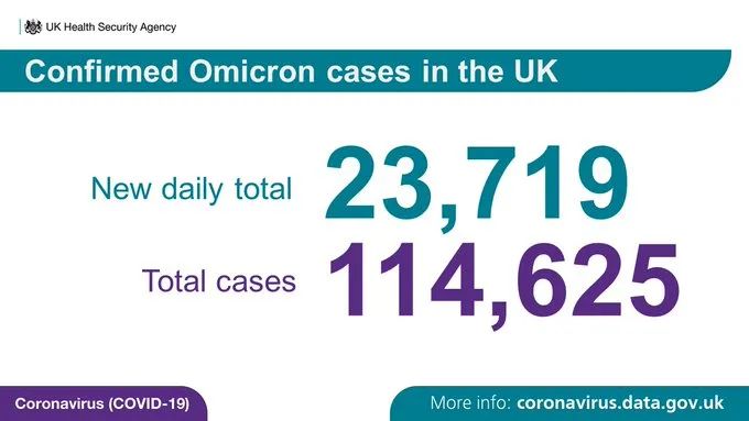 12月24日(周五),英国各地报告新增23,719例Omicron变种确诊病例。使得全英该新变种确诊病例总数为114,625例。