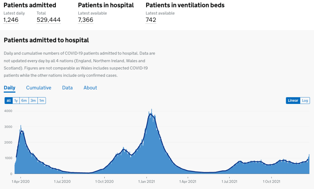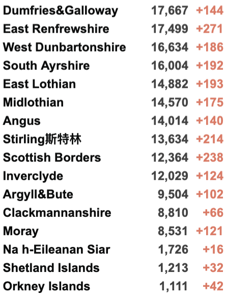从2021年3月5日以来,苏格兰地区共有26,580名(+72)确诊患者出院。截至12月24日午夜,近期住院的疑似/确诊新冠患者536名(-4),其中34名(-4)确诊新冠在重症监护室ICU。