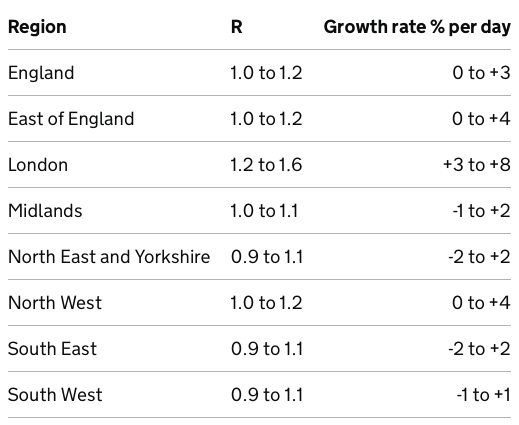 国家统计局(ONS)的最新数据显示,英国目前的感染率R值在1.0-1.2,这意味着,平均每10个感染者会感染10到12个其他人。增长率在0%和+3%之间。