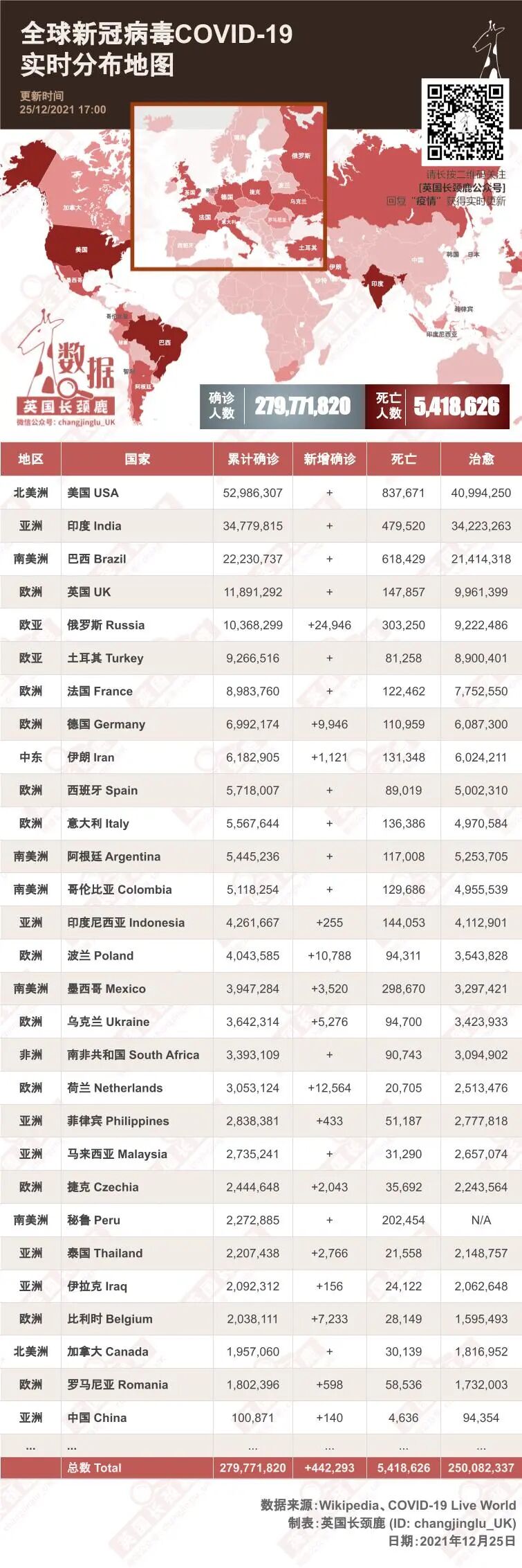 世界的累计确诊人数截止12月25日17:00超过2亿7,97万例(+442k),死亡超过541.8万例(+4k)。