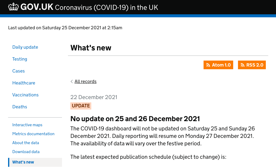 英国政府官网表示,因圣诞假期放假,2021年12月25日(周六)和26日(周日),将不会更新英国新冠相关数据。数据更新将于2021年12月27日(周一)恢复。
