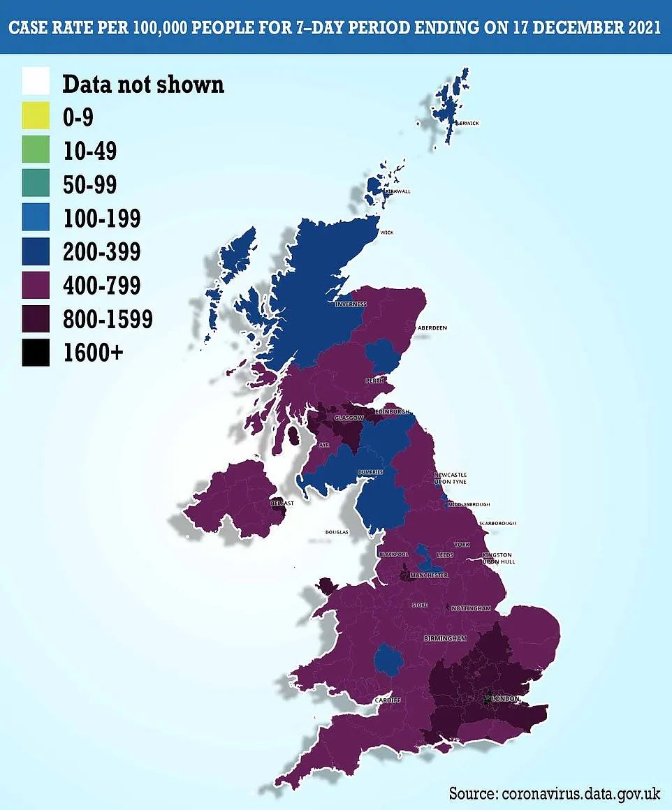 截至12月17日英国各地每十万人感染率 | 图片来源Dailymail