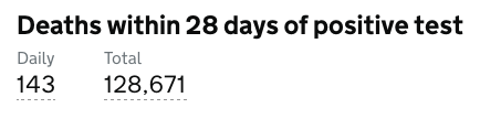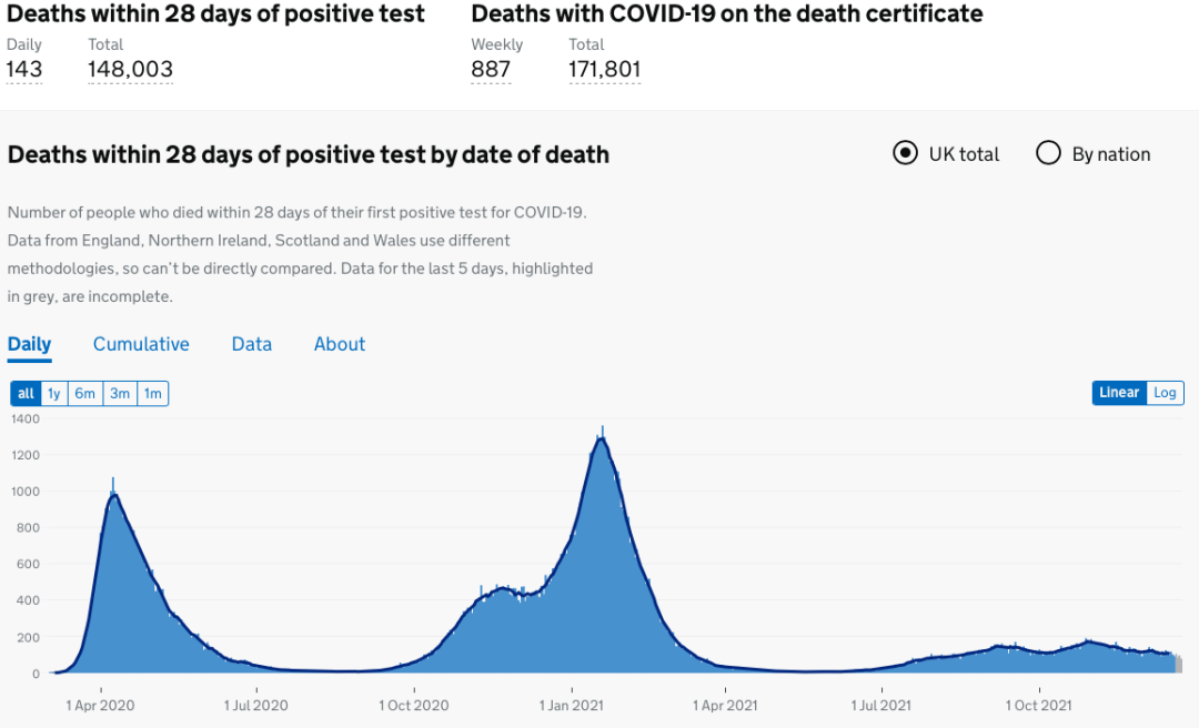 目前英格兰地区使用呼吸机的新冠患者有776人(+32);病亡新冠患者总计128,671人(+143)。