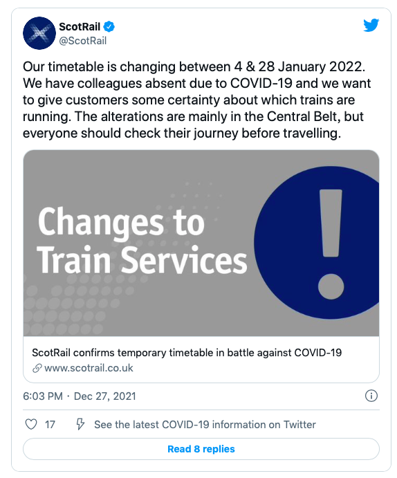 苏格兰铁路公司(ScotRail)在其社交媒体上宣布,在旷工已经导致部分线路在圣诞节前取消后,现因新冠相关原因造成员工短缺,该公司将削减其在1月份的铁路服务。现在已经改变了1月4日至28日的时间表。