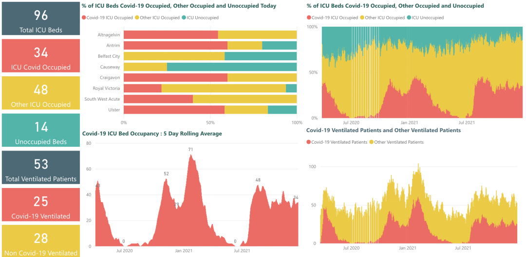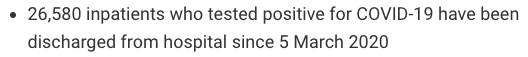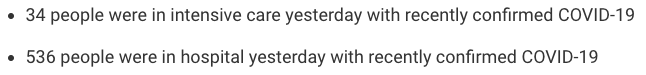 从2021年3月5日以来,苏格兰地区共有26,580名(+72)确诊患者出院。截至12月27日午夜,近期住院的疑似/确诊新冠患者536名(假期停更),其中34名(假期停更)确诊新冠在重症监护室ICU。
