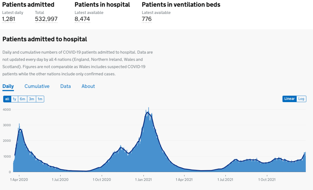英格兰住院人数最新数据及变化: