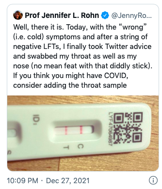 伦敦大学学院的细胞生物学家Jennifer L Rohn教授说,在对鼻腔取样的几次检测中结果都是阴性,但在对喉咙采样的检测中,结果呈阳性。