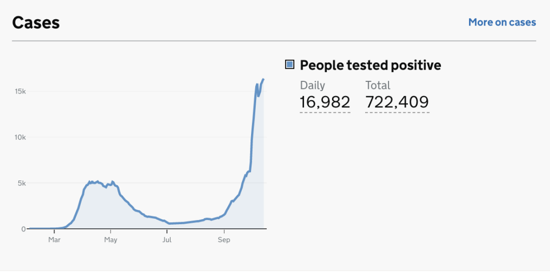 目前,英国每日新增确诊是一个月前的四倍,入院人数和死亡人数几乎是之前的三倍。并且就在目前的封锁情况下,全国各地的确诊依旧迅速上升。