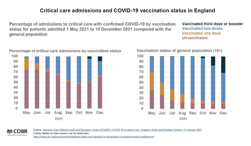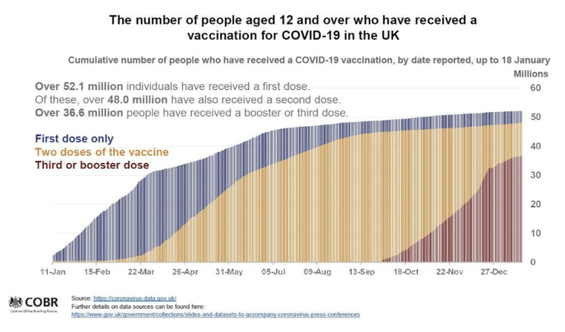 右图显示:2021年5月-12月英国总人口的疫苗接种比率,就2021年12月数据显示:超过30%已经完成了第3剂疫苗接种,只有不到10%人口没有接种任何疫苗。