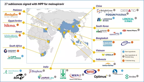 另外,新协议允许包括孟加拉国、中国、埃及/约旦、印度、印度尼西亚、肯尼亚、巴基斯坦、南非、韩国和越南在内的11个国家,27家仿制药制造商生产原料和成品药:其中,5家公司生产原料药,13家公司同时生产原料药/制剂,9家公司将生产制剂。